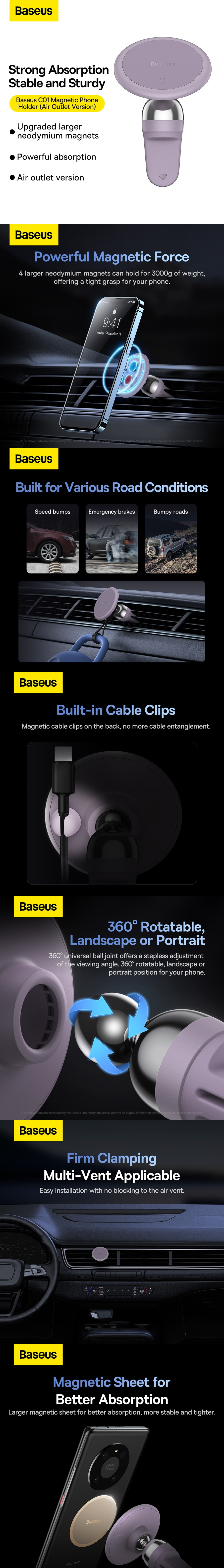 Baseus C01 er en universel magnetisk holder til ventilationsgitteret i bilen. Dens små dimensioner passer perfekt ind i ethvert rum. Sættet indeholder metalklistermærker.Baseus Magnetic C01 bilholder - Lilla