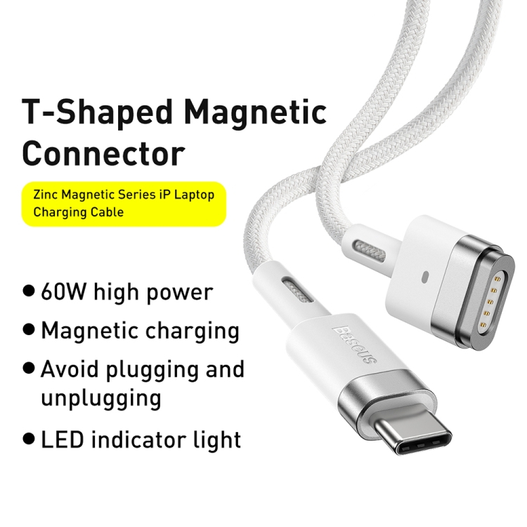 Baseus Zinc Magnetic Series Apple Laptop Charging kabel USB-C til T-formede port - 60W - 2 Meter - Hvid
