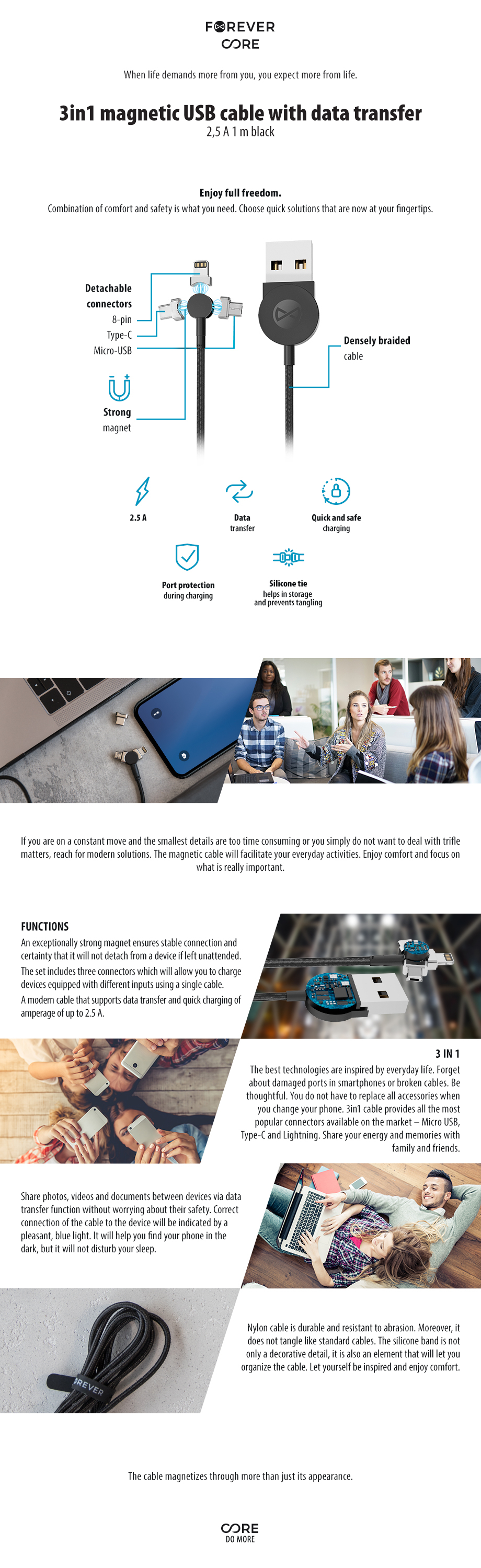 Den ekstra stærke magnet sikrer en stabil forbindelse og forhindrer den i at løsne sig fra andre enheder. Takket være de tre stik, der er inkluderet i sættet, kan du oplade udstyr med forskellige stik. Moderne magnetisk kabel Forever Core understøtter dataoverførsel og hurtig opladning på op til 2,5A. De bedste teknologiske løsninger er inspireret af hverdagen. Glem alt om ødelagte porte i smartphones og ødelagte kabler. Du behøver ikke at udskifte alt tilbehør med et skift af telefon. Magnetisk kabel 3 i 1 Forever Core udstyret med de mest populære stik tilgængelige på markedet - Micro USB, Type-C og Lightning. Del din energi og minder med dine kære. Brug muligheden for dataoverførsel og del fotos, videoer og dokumenter mellem enheder uden at bekymre dig om deres sikkerhed.