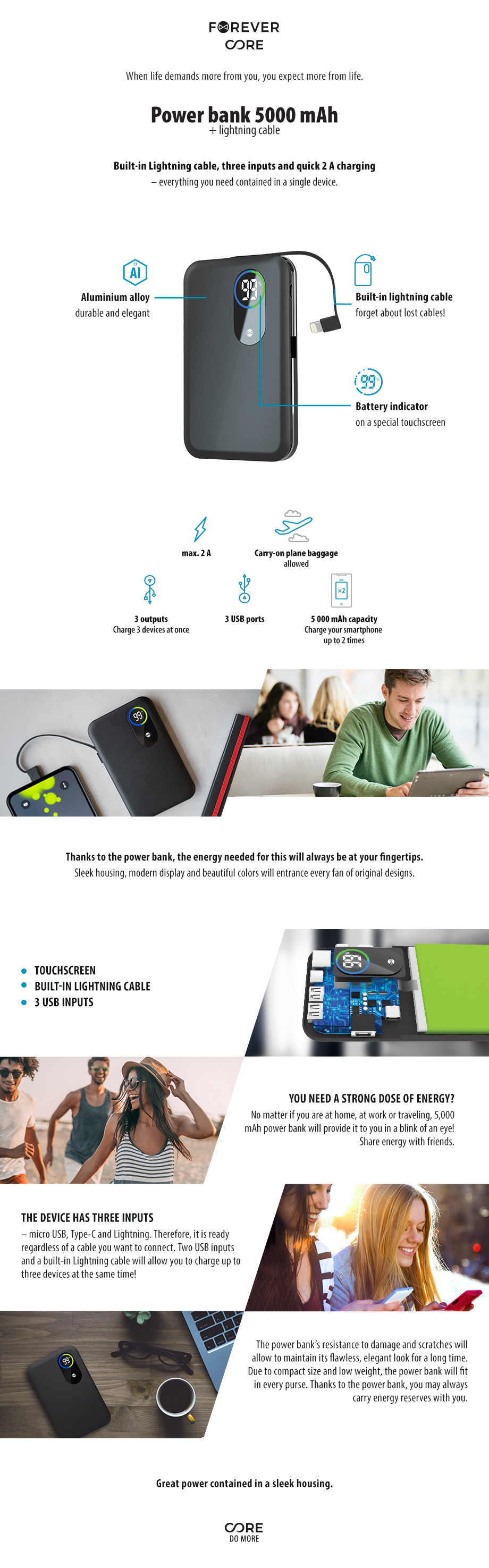 Med denne Powerbank behøver du ikke længere bekymret dig om en afladet telefon, den kan nemlig oplade din enhed på et øjeblik. Powerbanken kan oplade op til fire enheder på samme tid. Den har to USB ingange, Lightning udgang, Type-C indgang og Micro indgang. Der medfølger to omformer, en fra Type-C til Micro og en fra Lightning til Micro. På Powerbanken er der et digitalt display der viser hvor meget kapacitet der er på den.