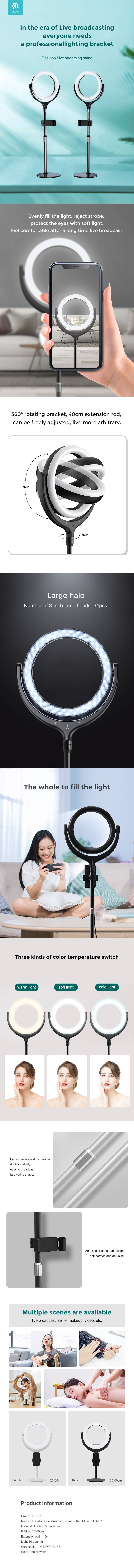 Denne Ring Light er udstyret med en holder, hvor du kan placer din Smartphone, dette kan være ideelt, hvis du skal tage fotos, optage en video eller foretage et videopkald. Højden på stativet kan justeres og den maksimale højde er 40 cm.