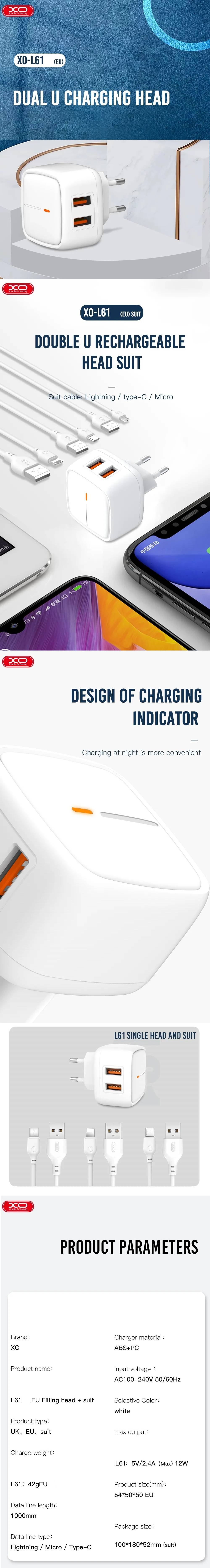 XO L61 er en avanceret netoplader med en max. 2,4 A strøm udstyret med to USB-stik, samt et USB-C Kabel